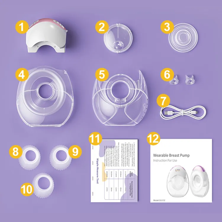 1. Collection Cup - Upper shell 2. Collection Cup - Lower shell 3. Instruction For Use 4. Pump Unit 5. Silicone Membrane 6. Front Chamber 7. Silicone Valve 8. Flange insert 18mm 9. Flange insert 21mm 10. Flange insert 24mm 11. USB Cable