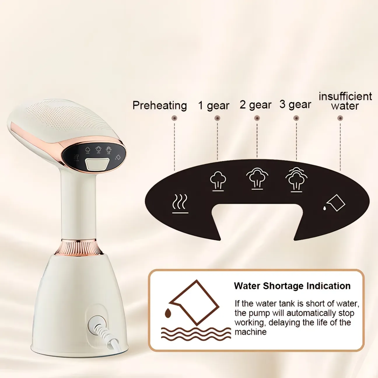 Equipped with a multi-function panel, preheat feature, and 3 steam levels for various garment needs. The built-in insufficient water warning ensures continuous performance by reminding you to refill.