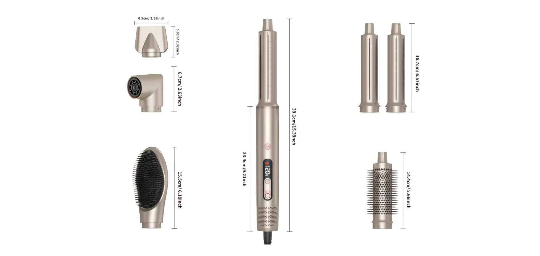 Includes hot air brush, left and ring curling barrels, drying and concentrator nozzles, and straightening brush head for versatile styling. Hot air brush dries hair quickly while creating natural curls; curling barrels shape soft waves effortlessly; nozzles focus airflow for faster drying; brush head smooths and straightens hair. Versatile and professional styling in one.