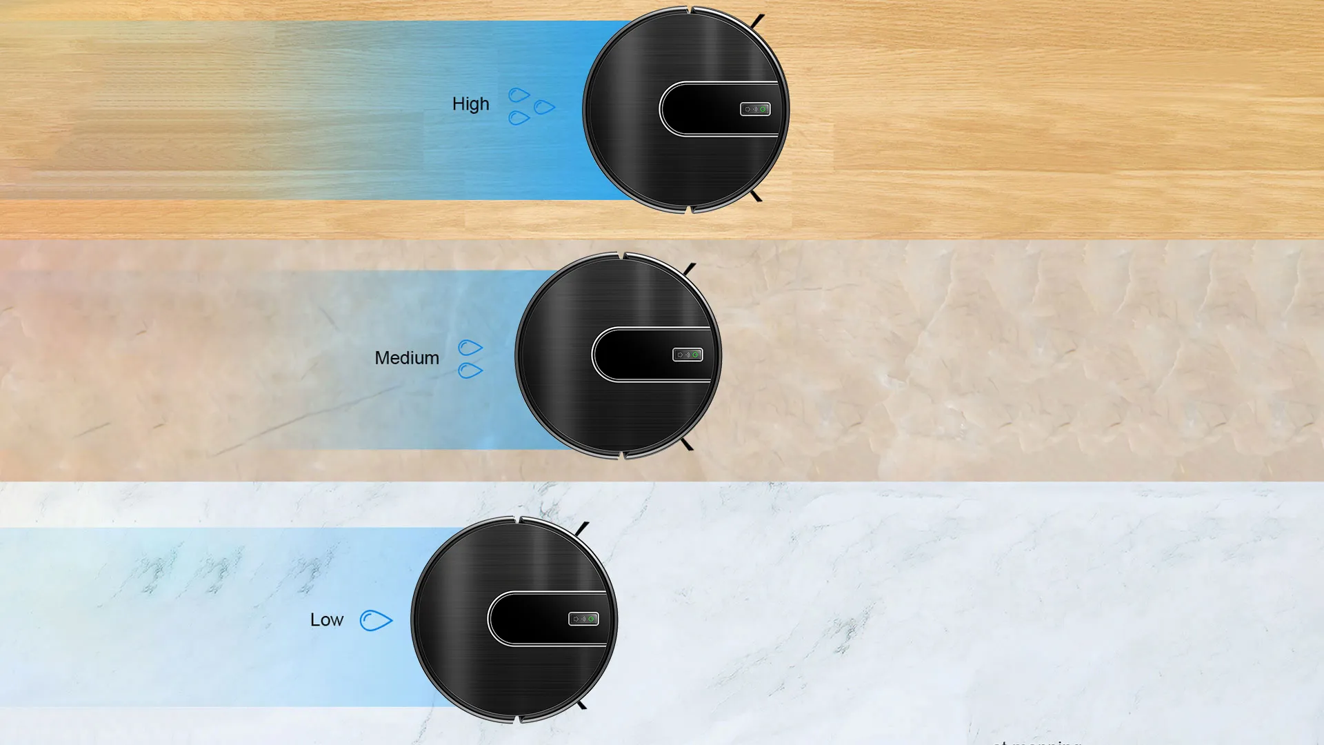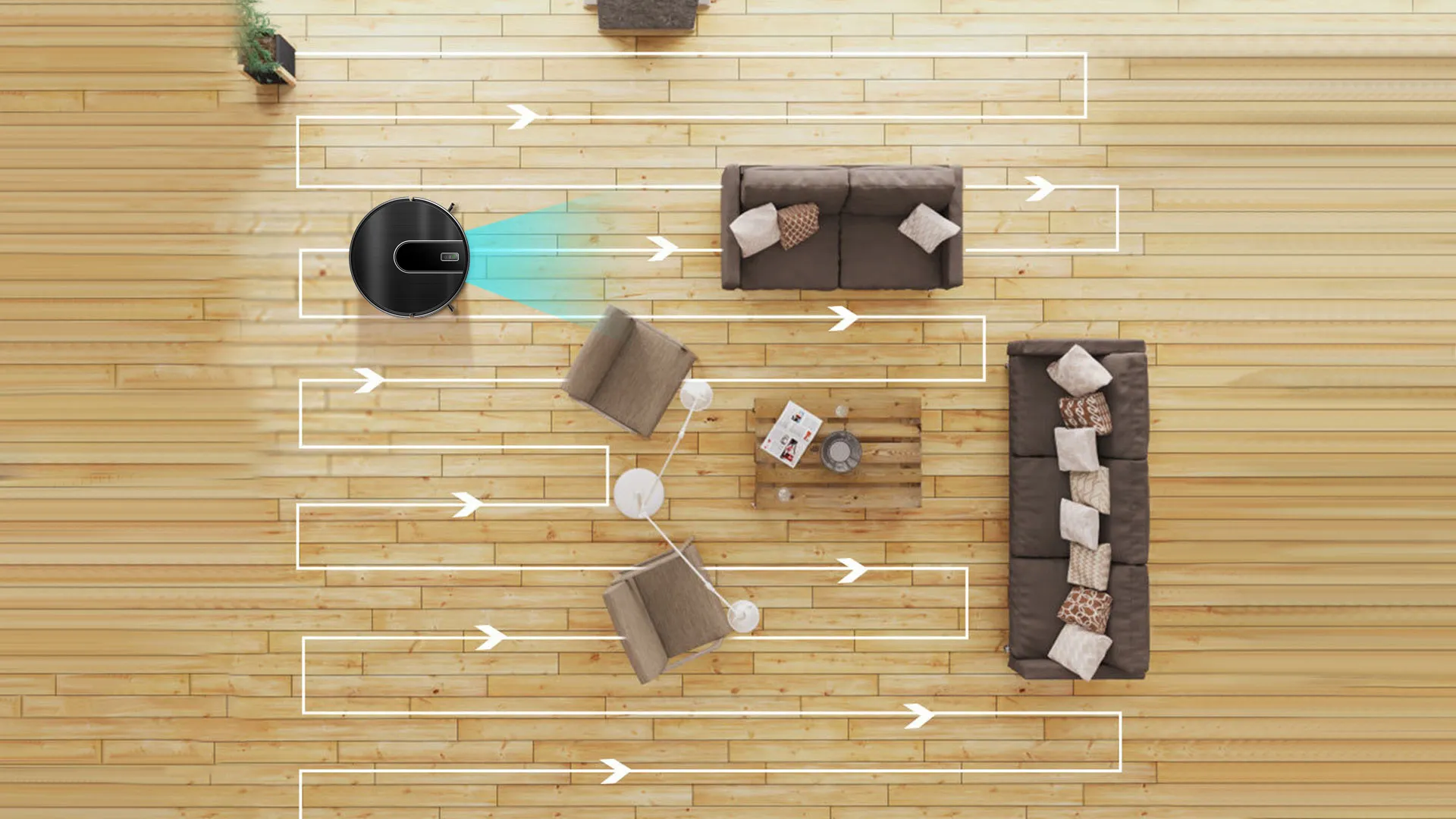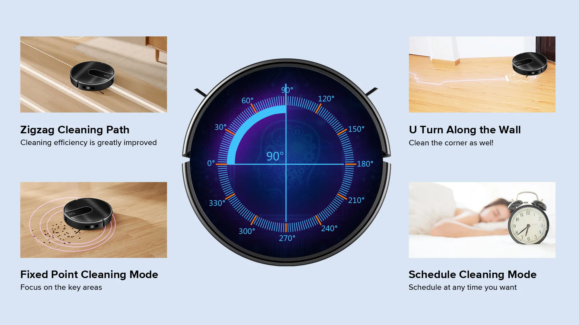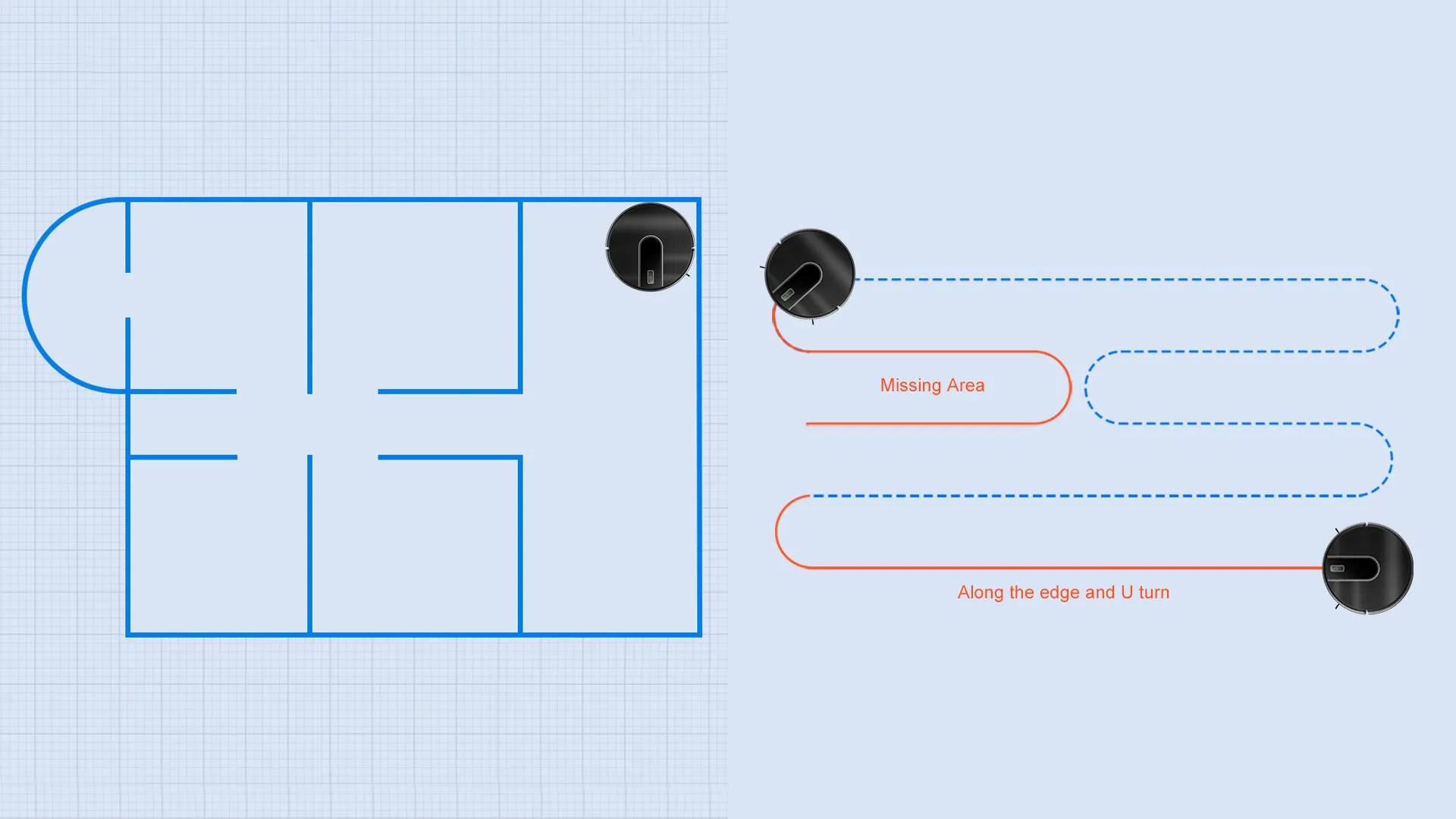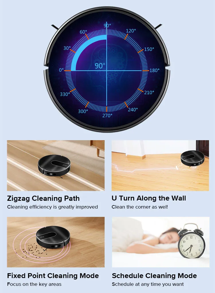 The coordinate storage algorithm allows the robot to recognize the surroundings and find the shortcut to charge when the battery is low. And the robot calculates how much power is needed in the remaining space, goes back, charges enough power and then continues cleaning. After cleaning, it returns to the original point (charging point).