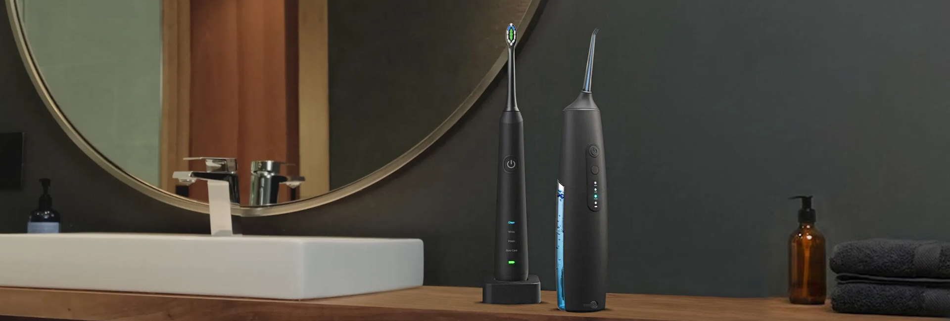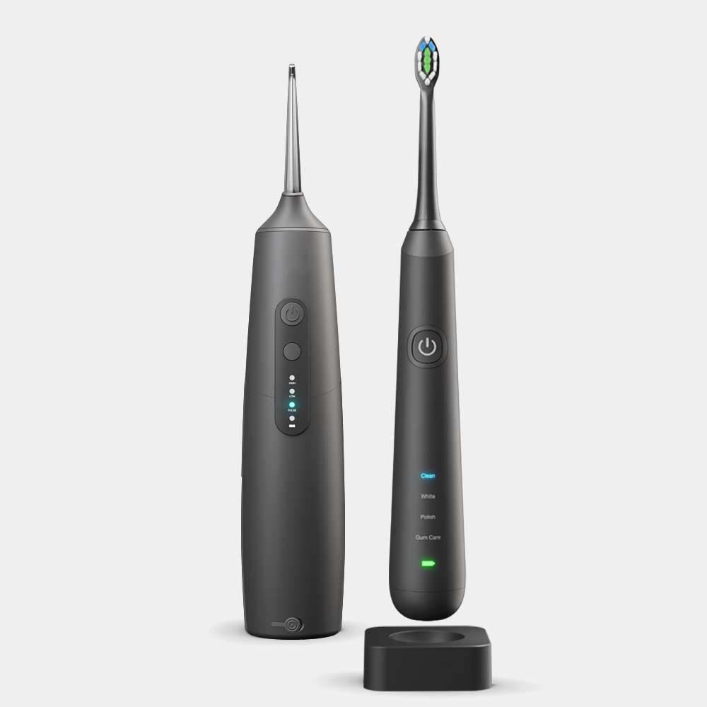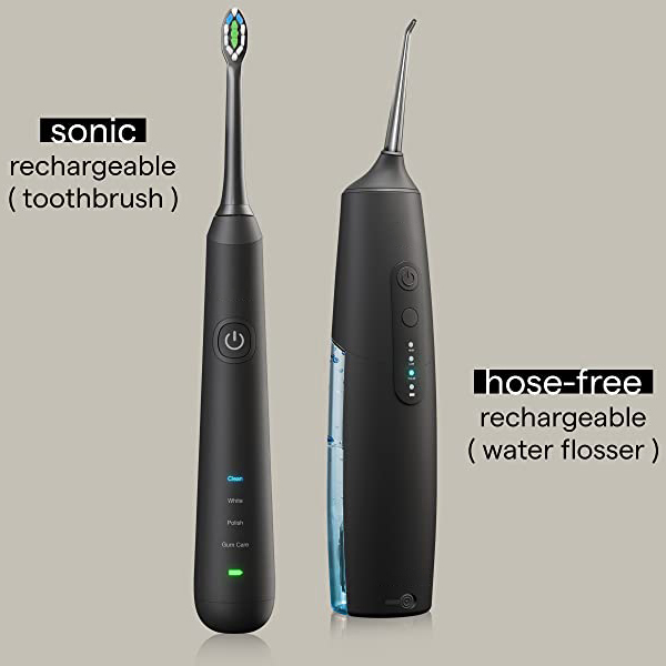 Colour: Black Waterproof: 100% Power Source: Battery Powered Whiten+Technology: 100% dentist-approved SenseIQ Technology Inductive Charging Tech 38,000 VPM Levitating Motor 4 Distinct Modes for a Custom Clean Brush Heads & Travel Case Included Water Flosser Electric Toothbrush Combo
