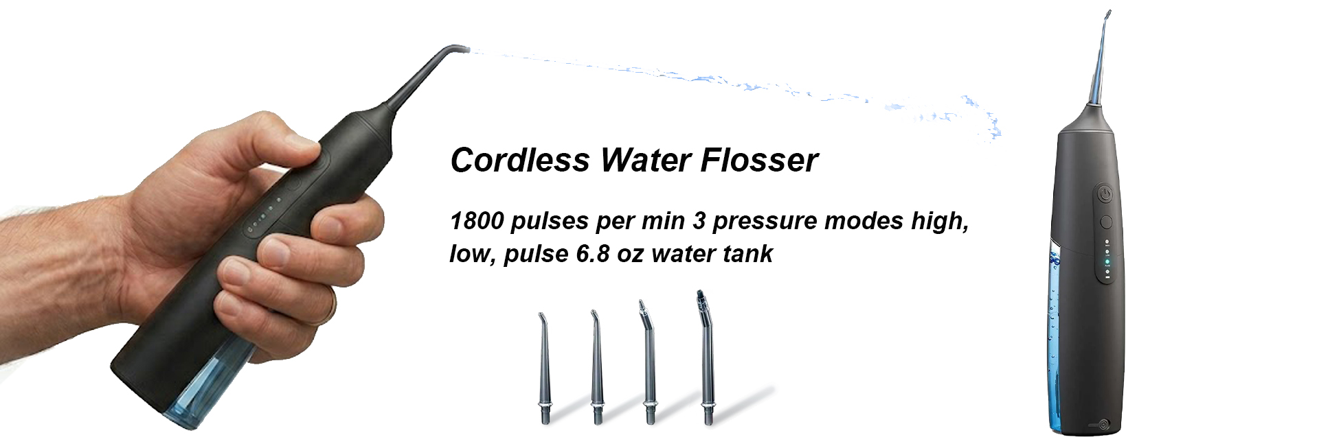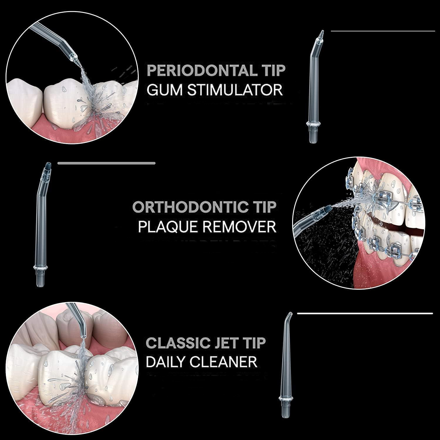 Newest Cordless Water Flosser offers a unique combination of water pressure with 3 flossing modes (High, Low, and Pulse) for the best teeth cleaning action and enhanced floss. Water pressure will massage your gums to prevent bleeding and deeply clean up dental calculus, food debris, that traditional flossing can't.